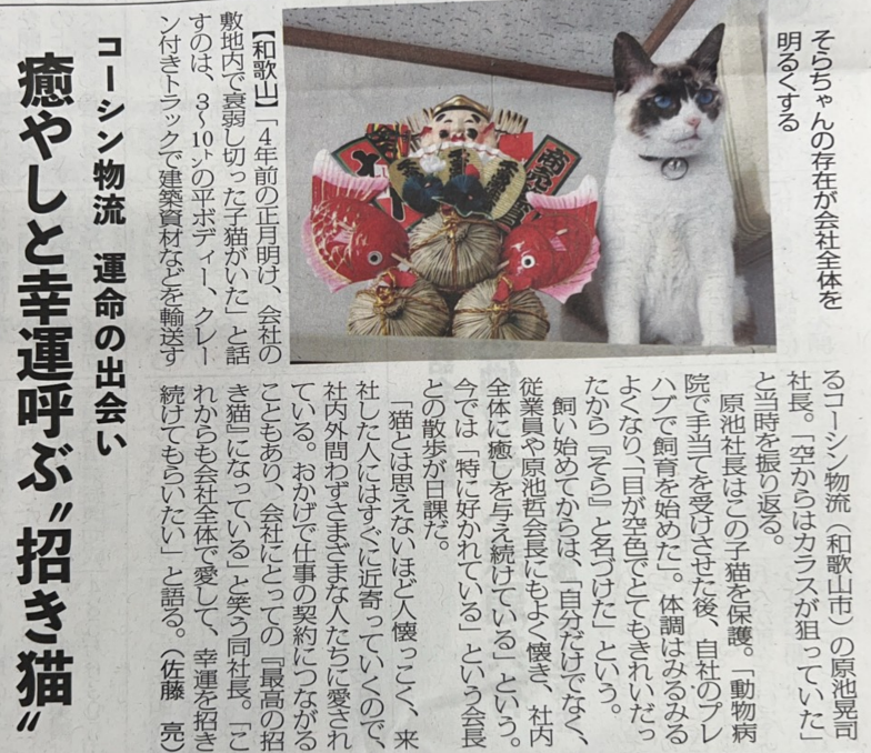 記事では、弊社で保護・育成している“招き猫”との出会いや、その存在が社内外に与えている癒やしや前向きな影響についてご紹介いただいております。